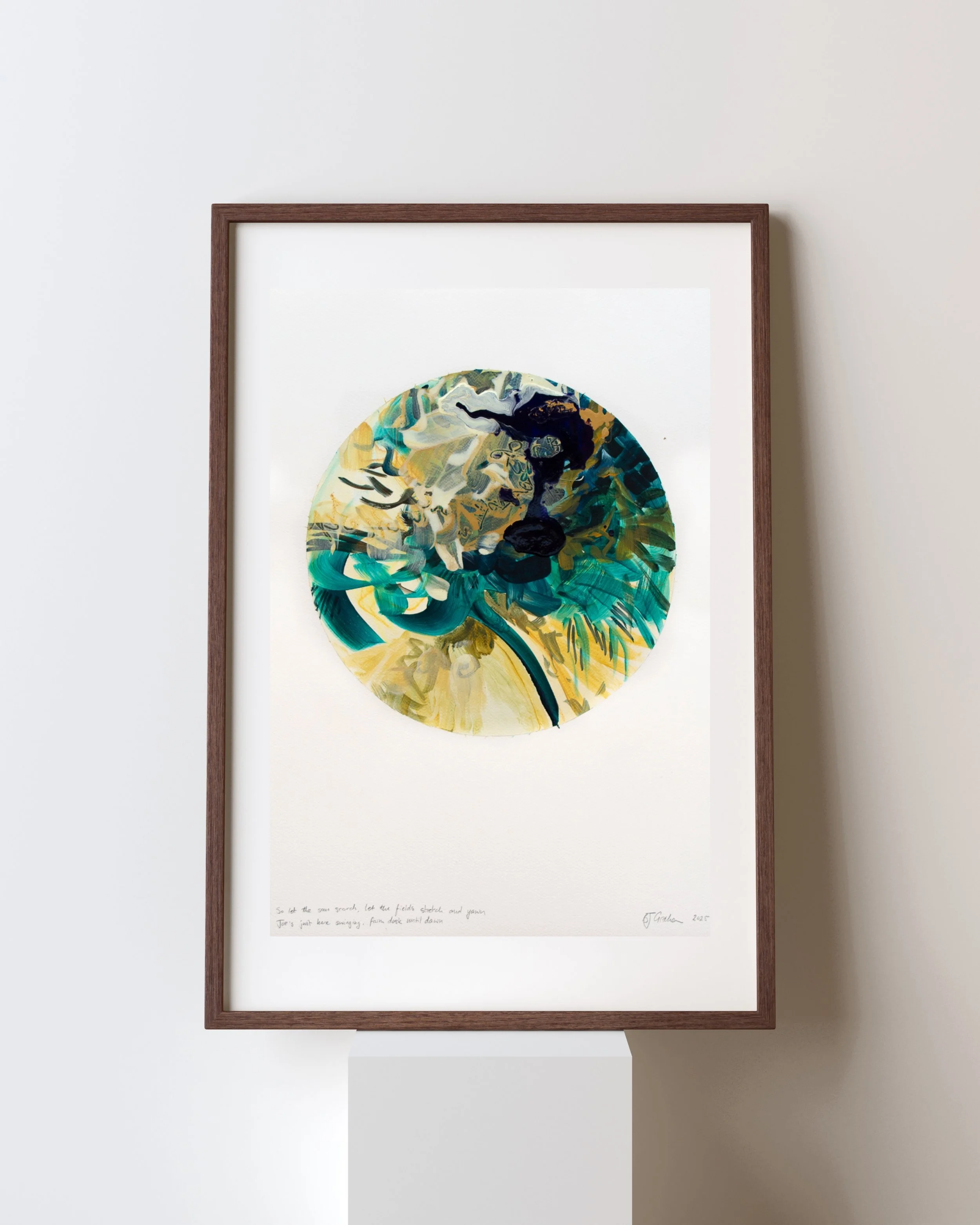 View fullsize So let the sun scorch, let the fields stretch and yawn. Jo’s just here swinging from dusk until dawn2025Acrylic on watercolour paper60 x 42cm View fullsize